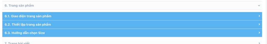 6. Trang sản phẩm: Mục này cho phép bạn chọn giao diện hiển thị trang sản phẩm, tuỳ chỉnh nội dung, giao diện trang sản phẩm, bảng hướng dẫn chọn size cho sản phẩm.