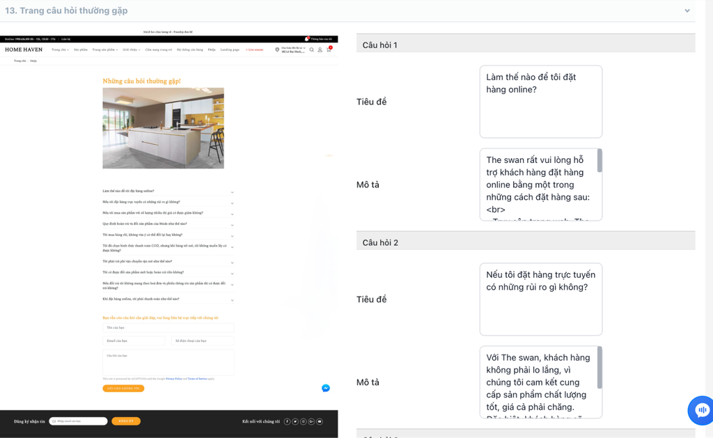 13. Trang câu hỏi thường gặp: Doanh nghiệp có thể tổng hợp bộ câu hỏi thường gặp theo đúng ngành hàng để cung cấp tại mục này để giải đáp nhanh chóng cho khách hàng, giúp giảm thời gian ra quyết định thực hiện chuyển đổi.