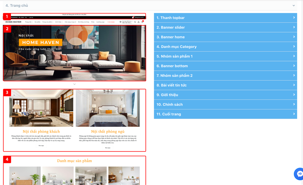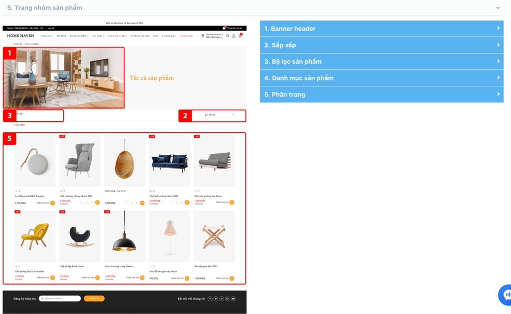 5. Trang nhóm sản phẩm: Tại đây bạn có thể điều chỉnh, banner đầu trang, bộ lọc sản phẩm, tính năng sắp xếp, bộ lọc sản phẩm, danh mục sản phẩm, phân trang. Mỗi mục đều được đánh số đỏ như hình bên theo thứ tự giúp bạn không bị nhầm lẫn trong quá trình chỉnh sửa.