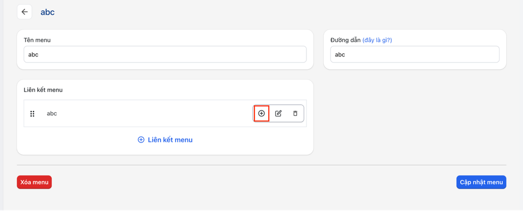 Nhấn dấu + tại menu bạn muốn thêm menu con.
