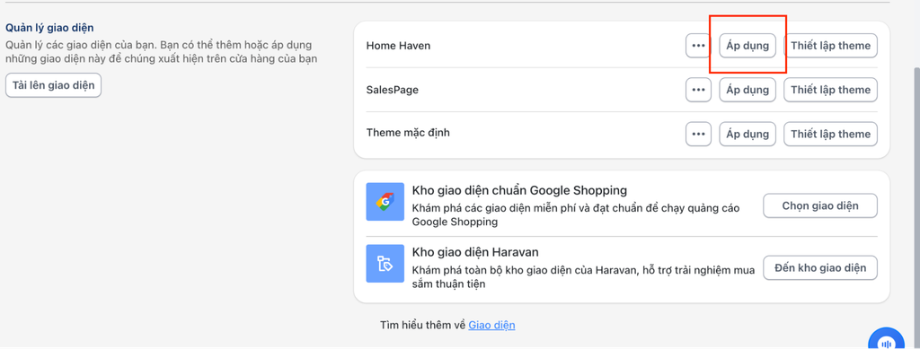 Giao diện sau khi chọn sẽ xuất hiện ở trên cùng, bạn có thể nhấn “Áp dụng” để sử dụng ngay theme vừa chọn, hoặc chọn “Thiết lập Theme” để điều chỉnh màu sắc, chữ, logo,....