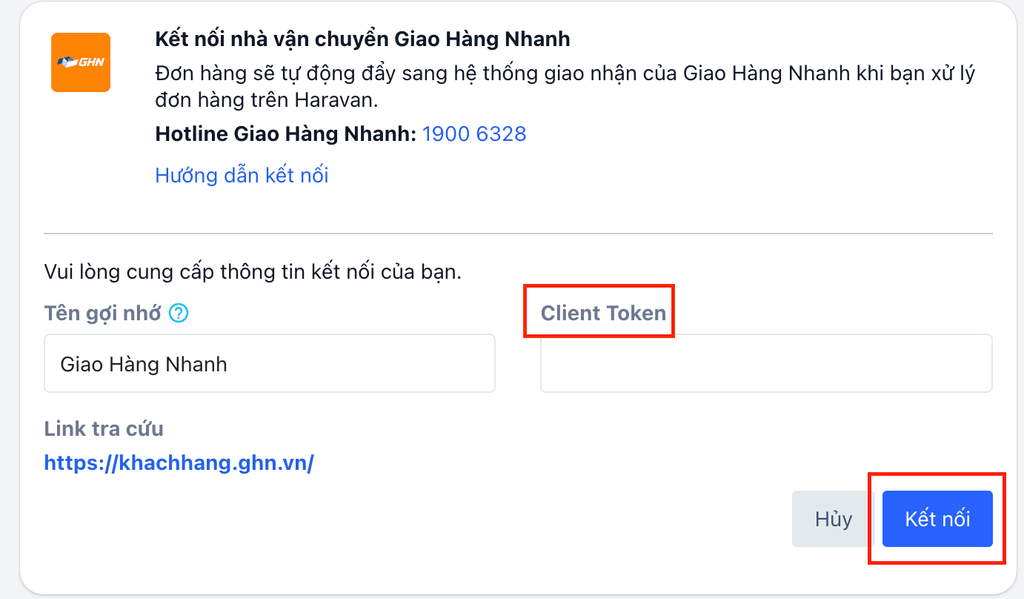 Đối với mục nhà vận chuyển: Chọn “Thêm nhà vận chuyển” → tại đơn vị vận chuyển muốn kết nối nhấn “dấu cộng” → nhập “Client Token” → chọn “Kết nối”.