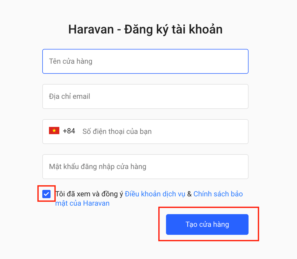 Khi đã điền thông tin, hãy chọn vào ô “Tôi đã xem và đồng ý Điều khoản dịch vụ & Chính sách bảo mật của Haravan”. Sau đó, nhấp vào “Tạo cửa hàng” để hoàn tất.