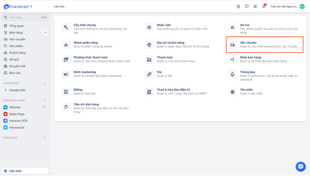 Tại mục “Cấu hình” chọn “Vận chuyển”.