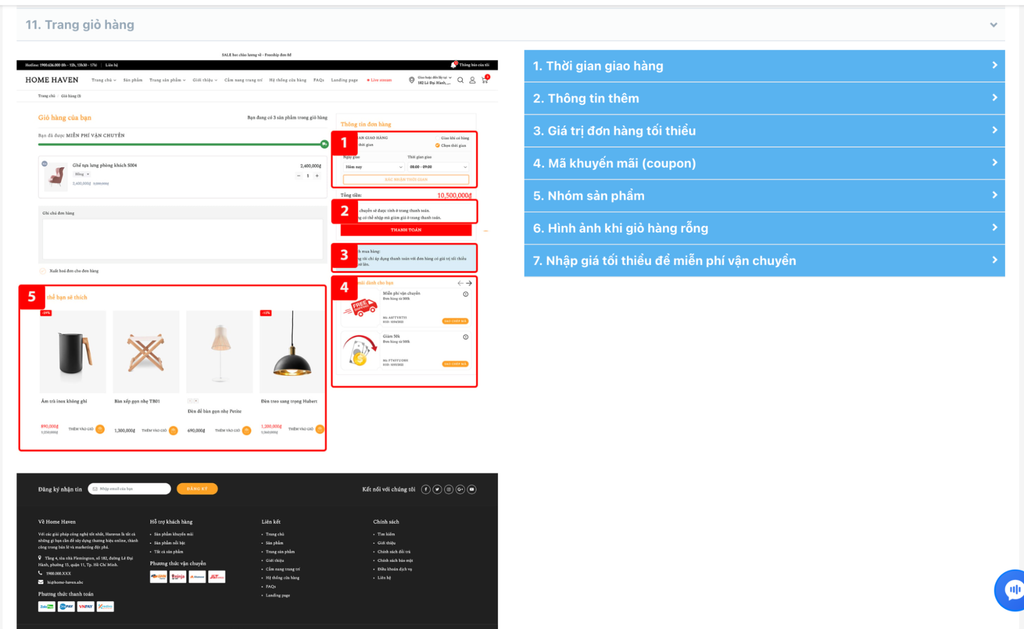11. Trang giỏ hàng: Cho phép bạn cài đặt một số thông tin cơ bản như thời gian giao hàng, thông tin thêm, giá trị đơn hàng,....