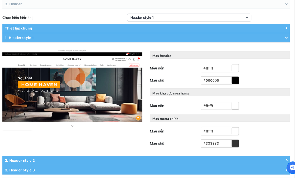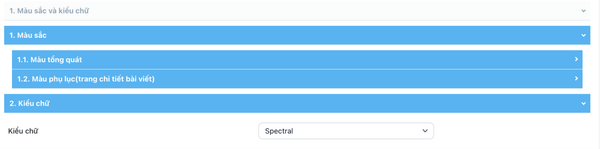 1. Màu sắc và kiểu chữ: Tại đây, bạn sẽ được lựa chọn màu sắc tổng quan cho trang giao diện, màu sắc phụ lục, kiểu chữ hiển thị trên website bằng cách nhấn chọn vào mục bạn muốn điều chỉnh.