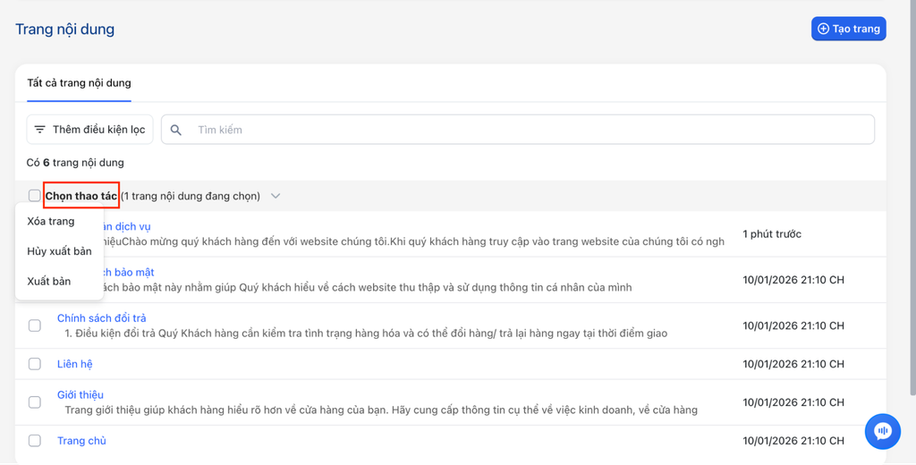Ngoài ra, bạn có thể thao tác xóa trang - huỷ xuất bản - xuất bản đối với trang nội dung mẫu bằng cách nhấn chọn ô trang nội dung muốn thực hiện thao tác → nhấn “Chọn thao tác”.