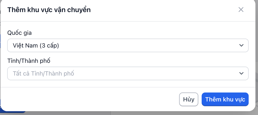 - Đối với các doanh nghiệp giao hàng trong nước (Việt Nam), mục “Quốc gia” là mặc định, bạn chỉ cần chọn “Tỉnh/Thành phố” mà doanh nghiệp bạn muốn giao hàng đến → Thêm khu vực.