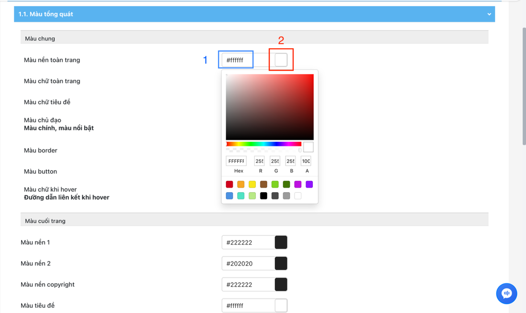 - Cách 1: Chuẩn bị sẵn mã màu bạn muốn thiết lập, copy và dán vào ô được đánh dấu 1 như hình dưới đây.