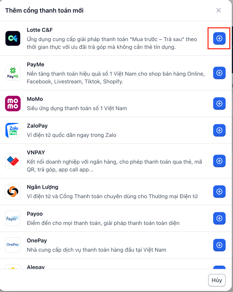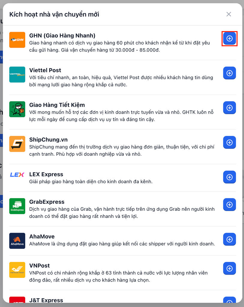 Chọn dấu cộng tại đơn vị vận chuyển bạn muốn kết nối.