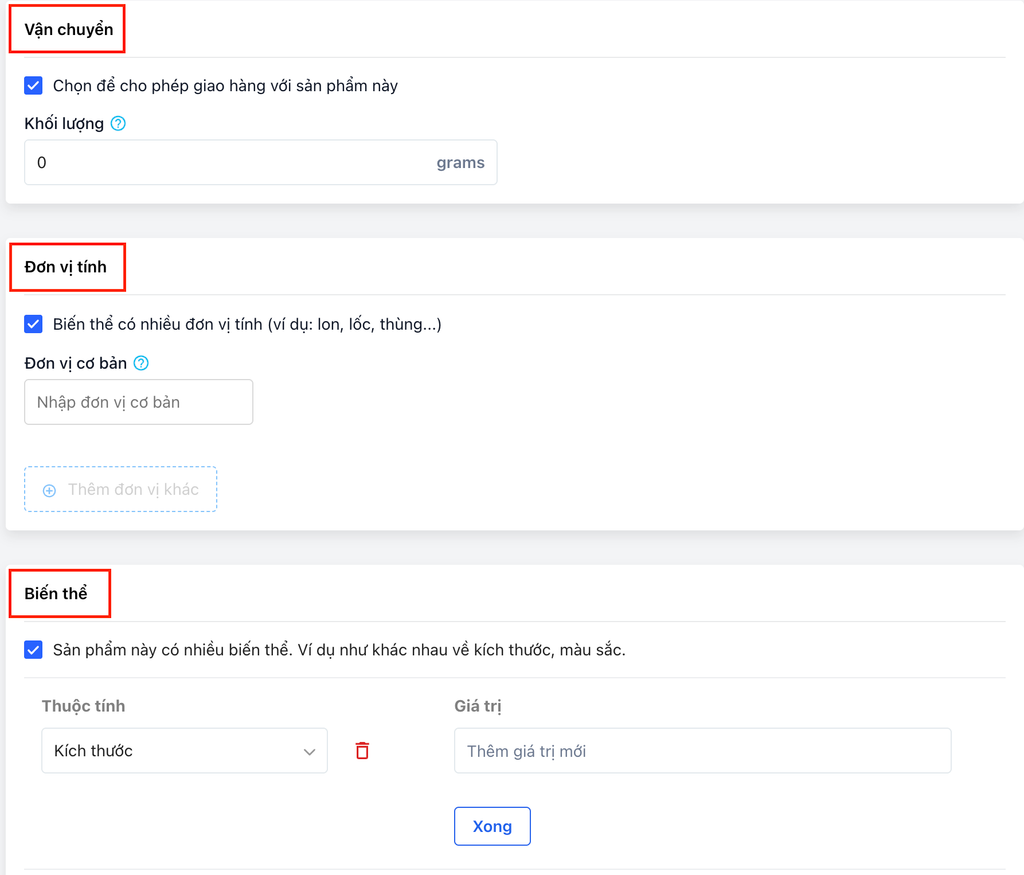 - Vận chuyển: Với sản phẩm vật lý, cần chọn vào ô vì để sản phẩm đến được với người mua thì cần phải có quá trình giao hàng diễn ra. Hãy nhập khối lượng cho sản phẩm, đơn vị mặc định là Gram. Nếu sản phẩm của bạn là dịch vụ (ví dụ: spa, phòng khách sạn,... ) thì bạn hãy bỏ chọn.