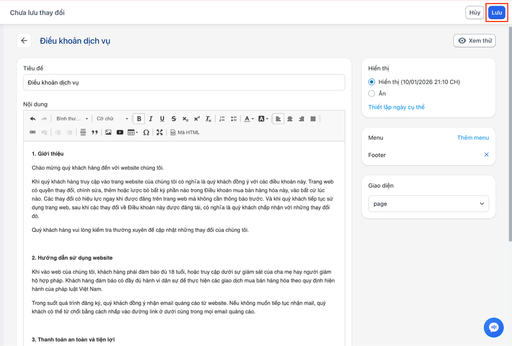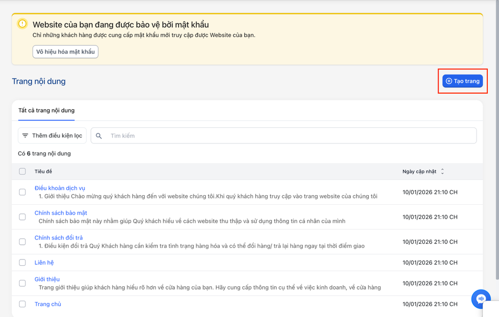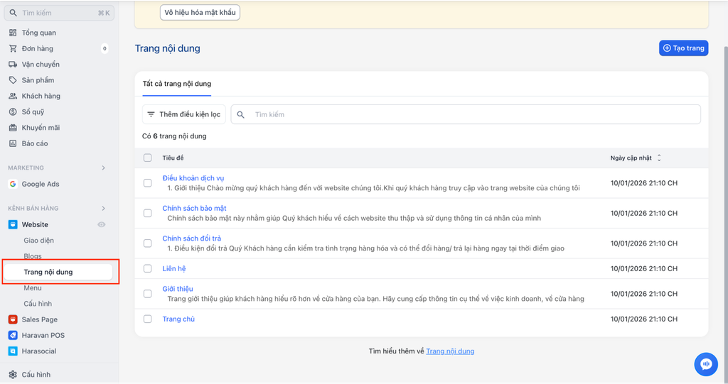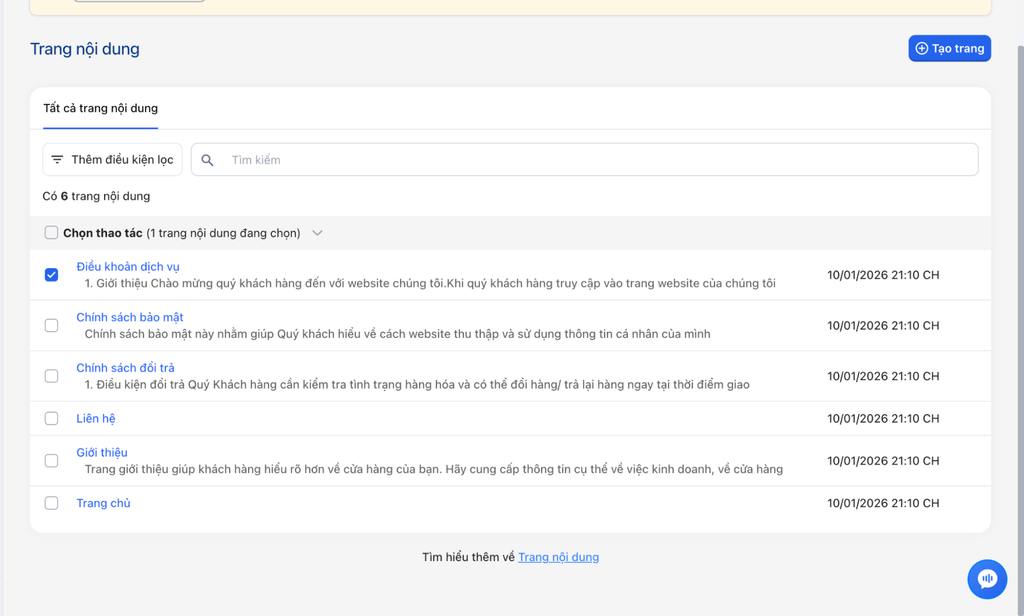 - Cách 1: Tự tạo trang theo giá trị thương hiệu, chính sách sản phẩm/dịch vụ của doanh nghiệp bằng cách chọn “Tạo trang” → điền thông tin & tối ưu SEO → lưu.
