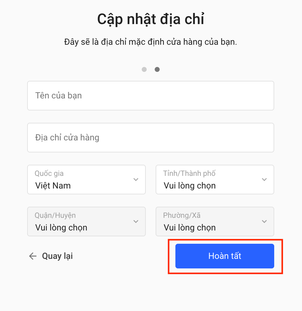 Điền đầy đủ thông tin địa chỉ cửa hàng để hoàn tất thiết lập tài khoản cửa hàng.