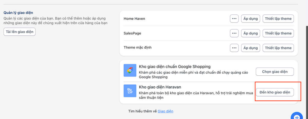 Chọn “Đến kho giao diện” để truy cập vào đa dạng mẫu website có sẵn của Haravan.