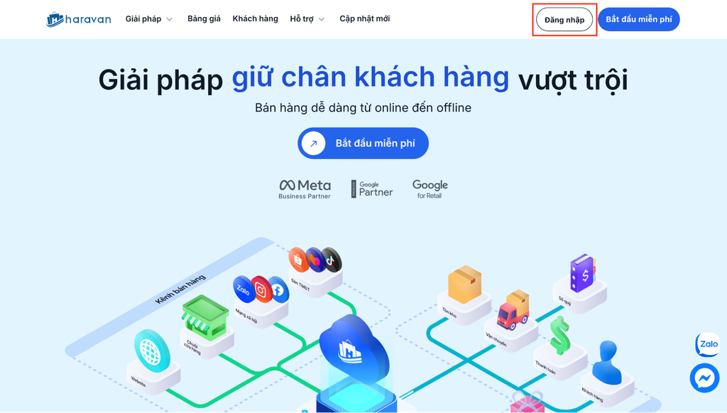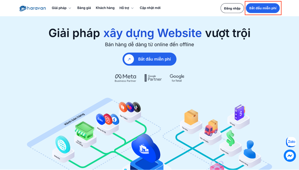 Để bắt đầu tạo tài khoản bán hàng với Haravan, bạn cần truy cập vào Haravan.com và nhấn vào “Bắt đầu miễn phí” nằm ở góc trên bên phải (như hình) để tiến hành tạo tài khoản dùng thử cho doanh nghiệp.