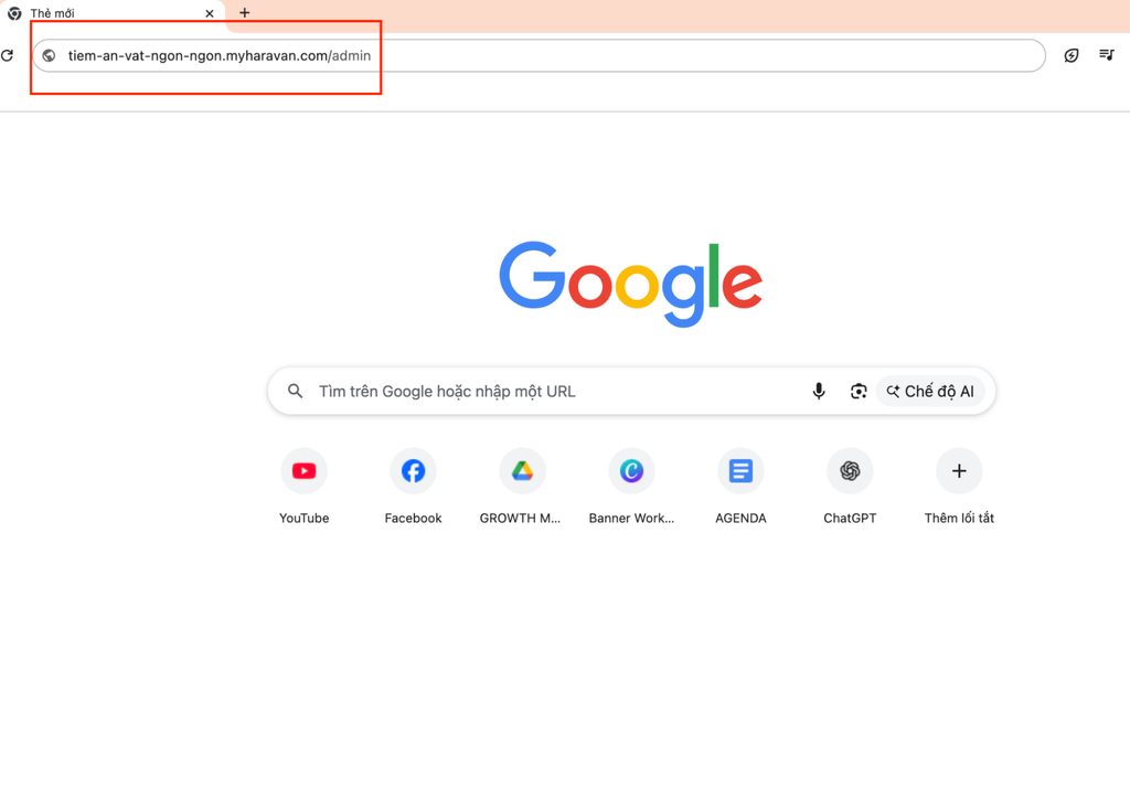 - Cách 2: Truy cập theo đường dẫn TênCửaHàng.myharvan.com/admin. Ví dụ: tên cửa hàng của bạn là “Tiệm Ăn Vặt Ngon Ngon”, bạn hãy đăng nhập theo cú pháp đường dẫn như sau: tiem-an-vat-ngon-ngon.myharavan.com/admin đề vào trang quản lý website.