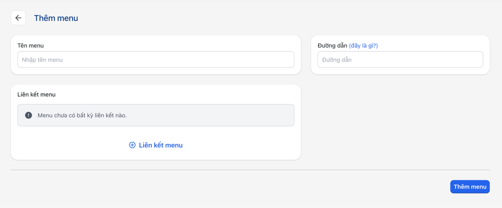 Sau đó điền thông tin vào “Tên menu” → thêm liên kết cho cây menu của bạn. Nhấn “Thêm menu” để hoàn tất.