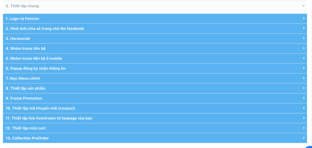 2. Thiết lập chung: Tại đây bạn được phép thiết lập và tùy chỉnh 13 mục bằng cách nhấp chọn vào mục muốn chỉnh, bao gồm: