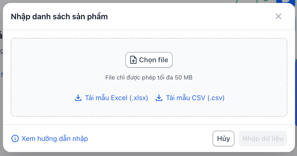 - Trường hợp 2: Khi tải file để hệ thống chỉnh sửa/cập nhật sản phẩm hàng loạt → cần chọn Chọn file và tìm file bạn cần tải lên → chọn Nhập dữ liệu và hệ thống sẽ trả kết quả qua mail của bạn.