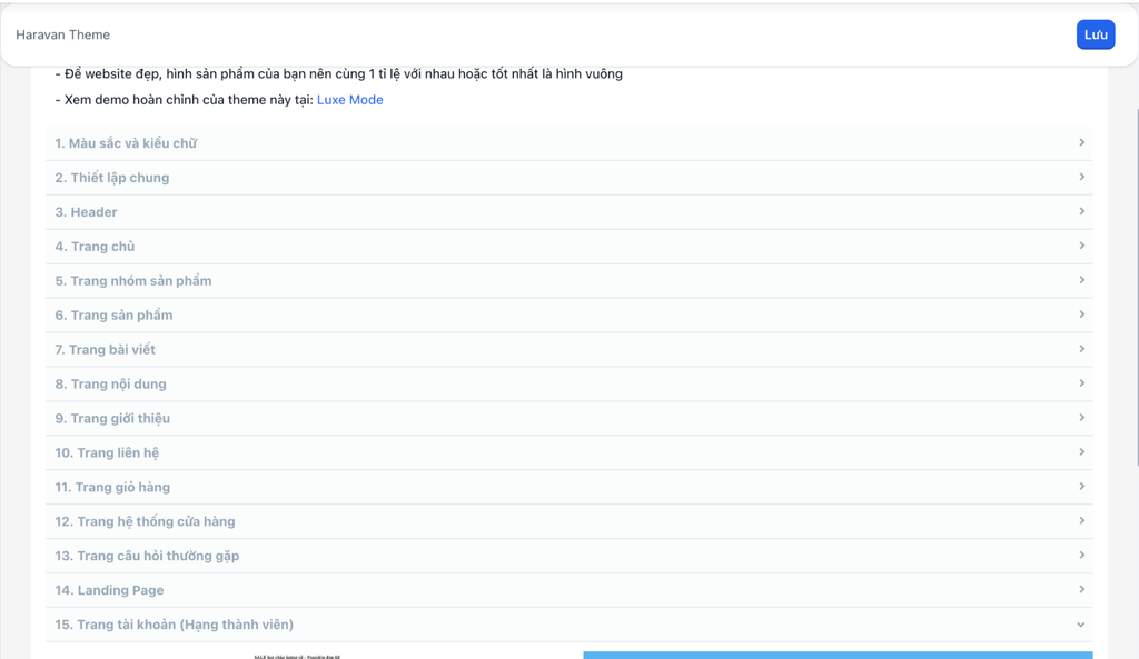 Tại đây, bạn có thể tuỳ chỉnh nhiều mục trên cửa hàng của bạn cách nhấn chọn vào mục muốn tùy chỉnh. Sau khi hoàn thành tất cả, nhấn “Lưu”.