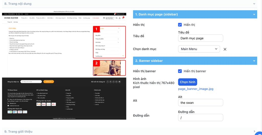 8. Trang nội dung: Cho phép bạn điều chỉnh danh mục page, banner sidebar.