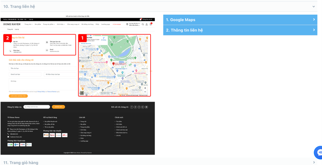 10. Trang liên hệ: Bạn được thiết lập vị trí cửa hàng trong Google Maps, thêm trường thông tin liên hệ của doanh nghiệp.