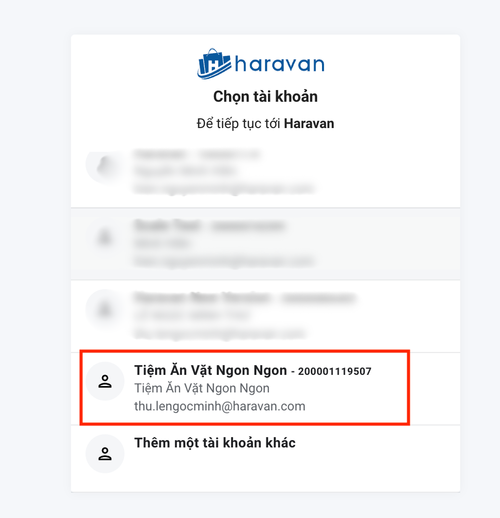 Chọn tài khoản website vừa tạo để đăng nhập vào hệ thống quản lý cửa hàng của Haravan.