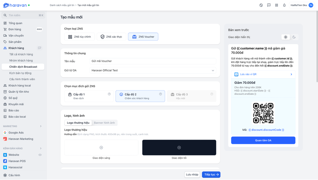 Với các tin ZNS có nội dung gửi mã voucher, Zalo yêu cầu bắt buộc phải sử dụng mẫu template voucher chuẩn mới. Đáp ứng thay đổi này, Haravan cập nhật tính năng tạo template voucher theo đúng định dạng Zalo yêu cầu, đồng thời hỗ trợ lựa chọn cấp độ gửi tin ngay trong quá trình tạo template, giúp tiết kiệm thời gian và đảm bảo đúng chuẩn khi gửi tin đến khách hàng.