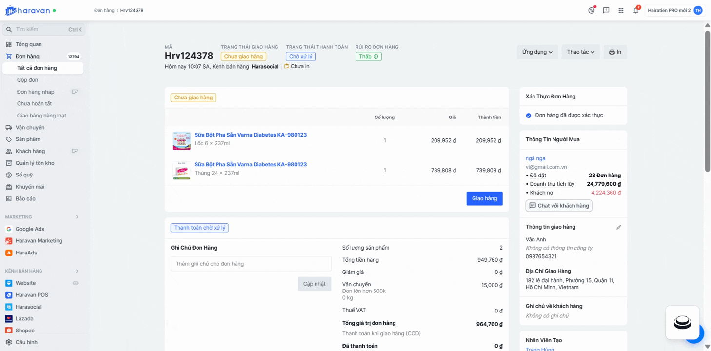 Nhằm tối ưu quy trình chăm sóc khách hàng và xử lý đơn, Haravan đã bổ sung nút chuyển nhanh đến khung hội thoại tương ứng đã tạo trên Harasocial. Tính năng này giúp nhà bán hàng dễ dàng liên hệ lại với khách để trao đổi thông tin đơn hàng mà không cần mất thời gian tìm kiếm thủ công. Việc tương tác được rút ngắn chỉ với một cú nhấp, mang lại trải nghiệm quản lý đơn hàng tiện lợi và liền mạch hơn bao giờ hết.