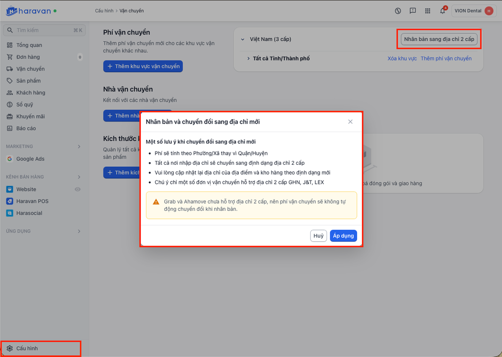 Cập nhật: Hệ thống Haravan đã cập nhật và chuẩn hóa toàn bộ dữ liệu địa chỉ khách hàng theo quy định hành chính Việt Nam 2 cấp. Lưu ý: Hiện chỉ có 3 nhà vận chuyển là GHN, J&T Express và Lazada đã hỗ trợ cập nhật địa chỉ 2 cấp, những đơn vị giao hàng còn lại chưa hỗ trợ.