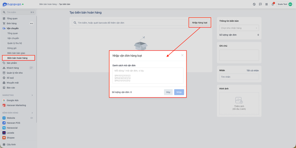 Cập nhật: Cho phép nhập hàng loạt vận đơn vào biên bản hoàn hàng, giúp thao tác nhanh hơn, giảm lỗi nhập liệu và tối ưu quy trình xử lý hàng hoàn cho những đợt hoàn nhiều đơn cùng lúc.