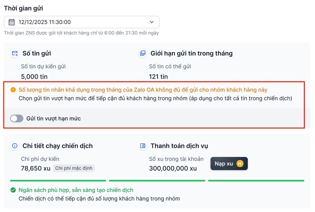 Cập nhật: Bổ sung thêm nút bật/tắt cho phép gửi tin nhắn vượt hạn mức. Khi bật, tính năng sẽ tự động ghi nhận nhu cầu gửi tin nhắn vượt hạn mức và gửi yêu cầu sang Zalo, giúp nhà bán hàng tiết kiệm tối đa thời gian thao tác thủ công, rút ngắn thời gian duyệt và giữ cho các chiến dịch hậu mãi được diễn ra liền mạch.