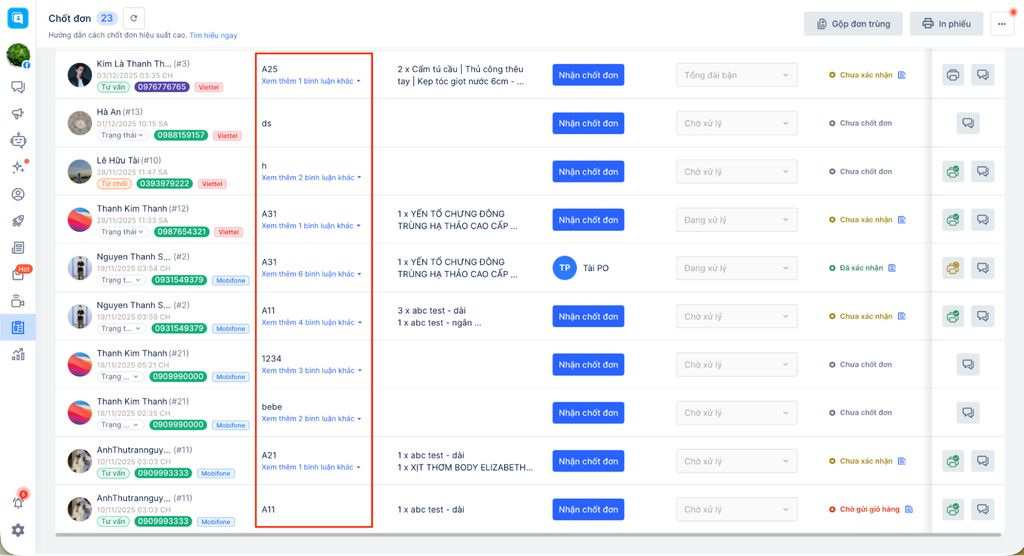 Trước đây: Khi khách hàng bình luận trong một chiến dịch Livestream, tab “Chốt đơn” sẽ tự động ghi nhận toàn bộ nội dung khách hàng bình luận thay vì làm nổi bật từ khóa cần chốt đơn. Ví dụ, khách hàng bình luận: “Tôi đã thêm sản phẩm có mã A11 vào đơn hàng, bạn kiểm tra giúp tôi nhé”, hệ thống sẽ tự động ghi nhận cả câu bình luận thay vì tập trung vào từ khóa A11.