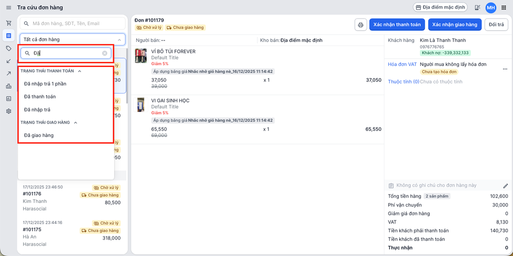 Cập nhật: Bổ sung thêm trạng thái “Nhập trả 1 phần” và “Chưa giao hàng”. Đồng thời, hỗ trợ nhân viên tra cứu nhanh trạng thái đơn hàng cần tìm kiếm.